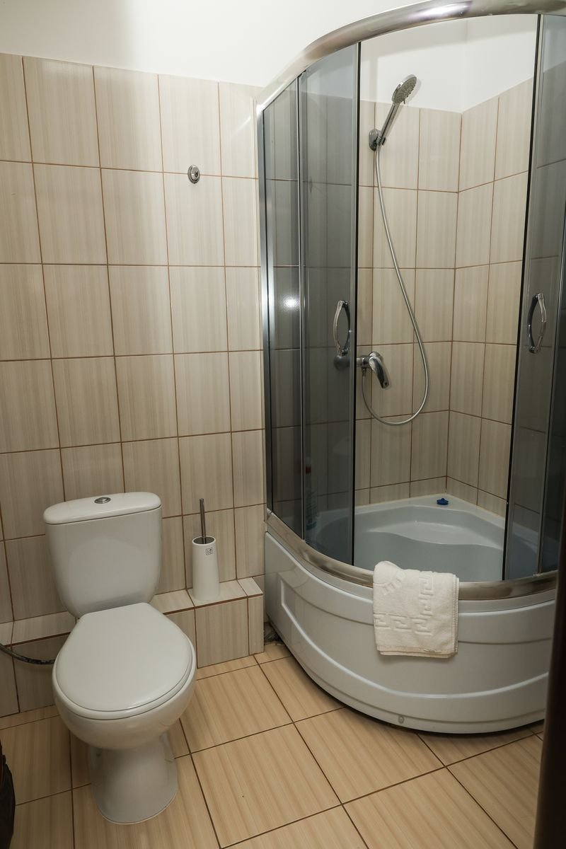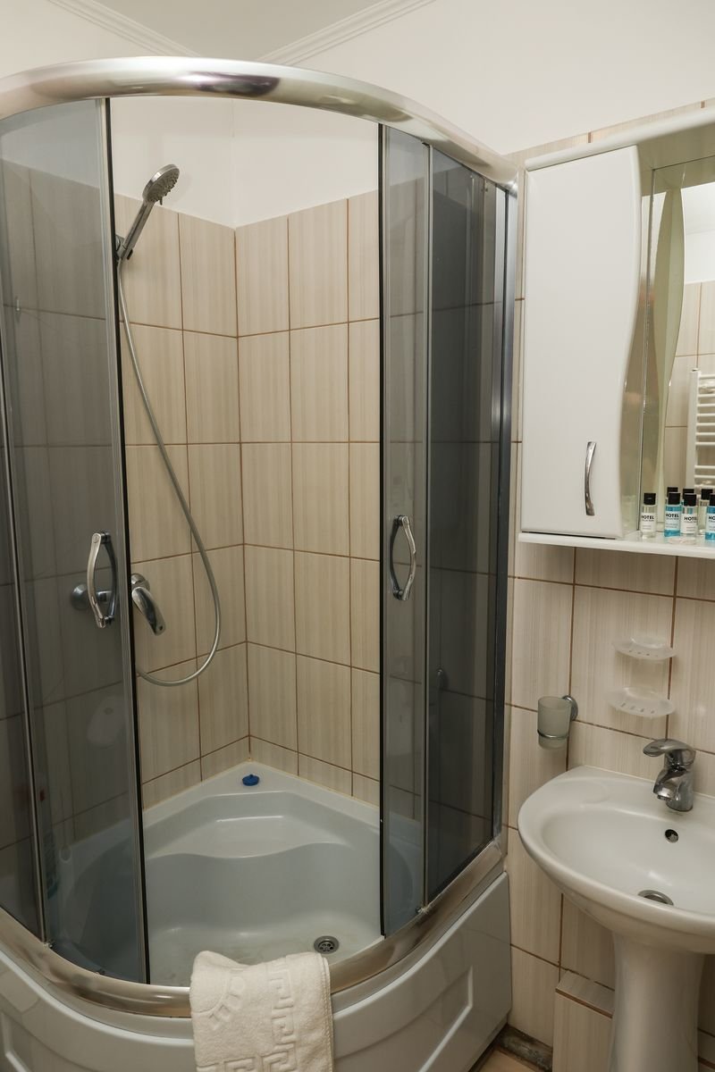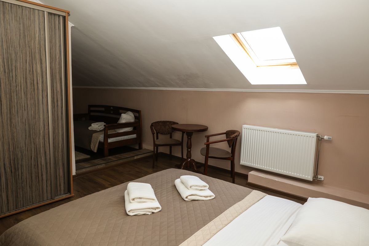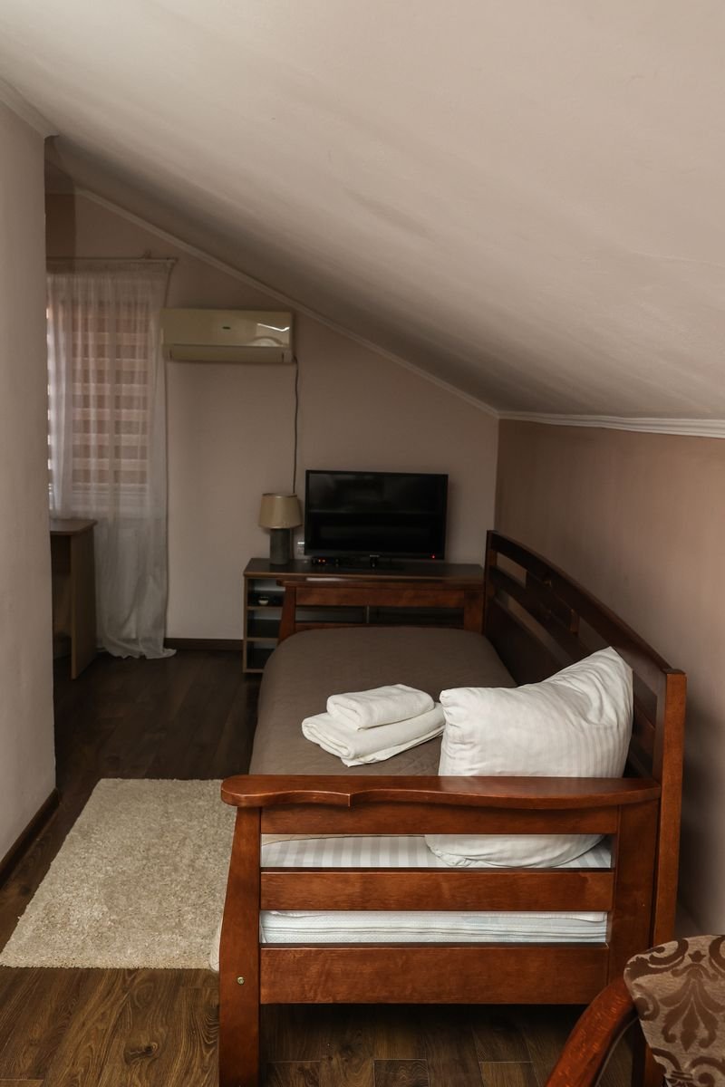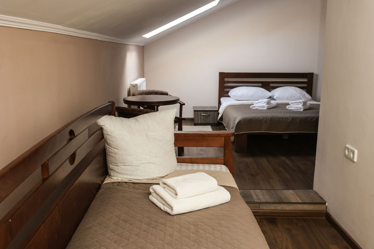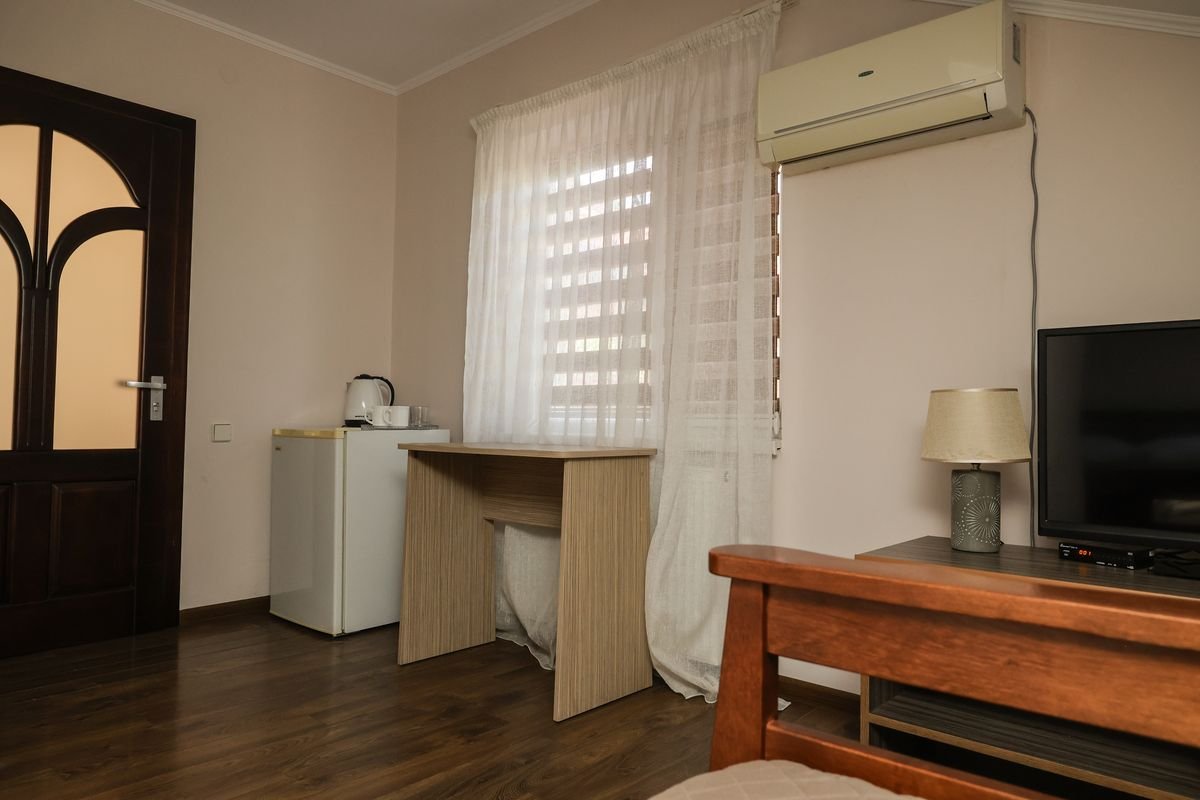 3-х місний №1: суцільне 2-х спальне ліжко і одне односпальне, холодильник, телевізор, чайник, чашки, стакани, душова кабінка, санвузел, кондиціонер. Комплектація номеру: рушники по 2 кожну особу, косметична викладка (один раз при поселенні), постільна білизна.